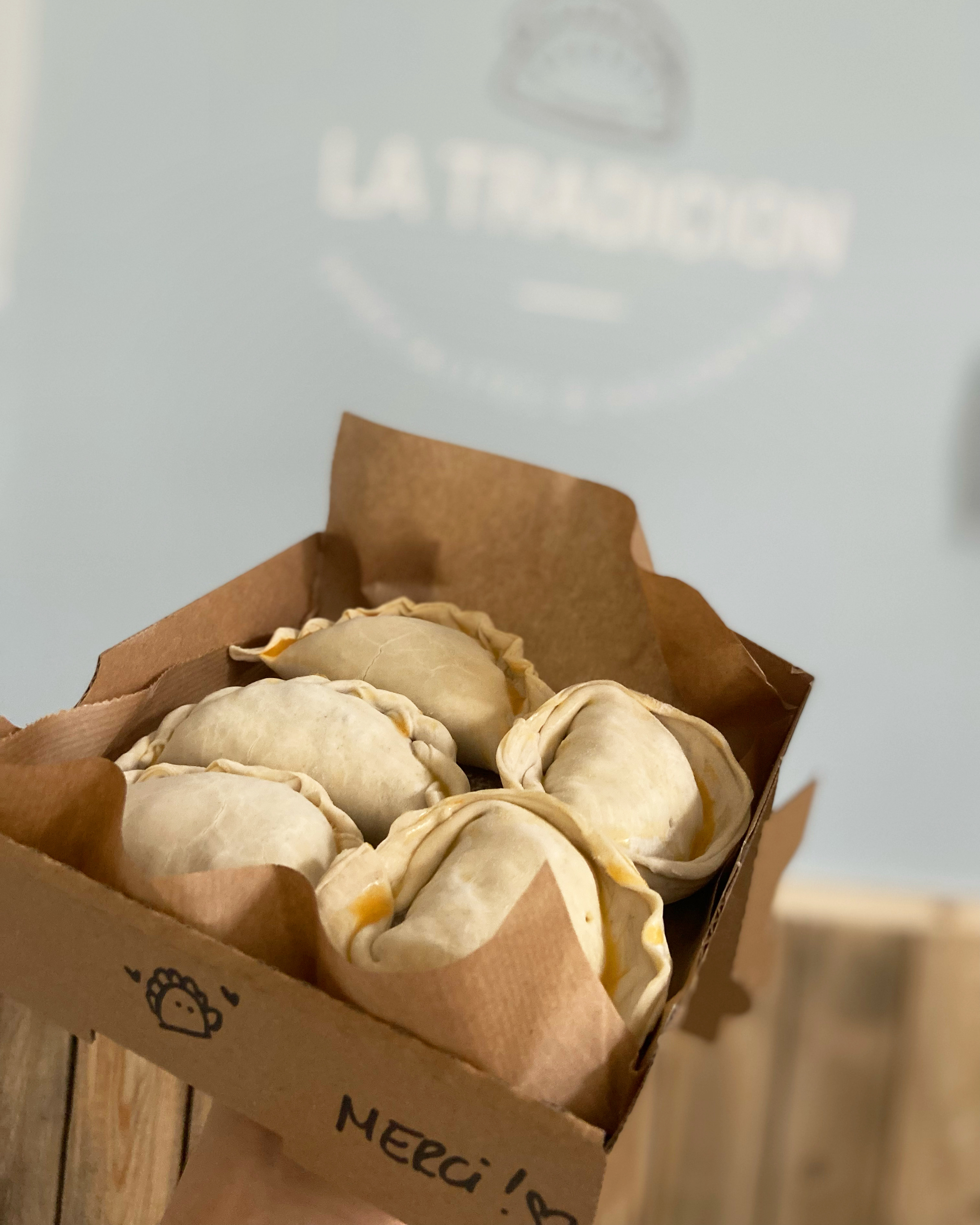 Posté le 09/04/2022 à 11:50"Nous sommes allés ce midi à La Tradicion pour goûter les empanadas typiques d’Argentine. La boutique est vraiment super jolie, la patronne est super sympa et très accueillante. L’odeur dès qu’on entre nous fait voyager en un instant. Pour 3 personnes nous avons pris un assortiment de 12 empanadas. Ils sont tous très bons avec une énorme préférence pour la recette à la viande et la recette Humita. Une vrai délice! Une adresse à connaître et à partager. Nous y retournerons, c’est certain!"