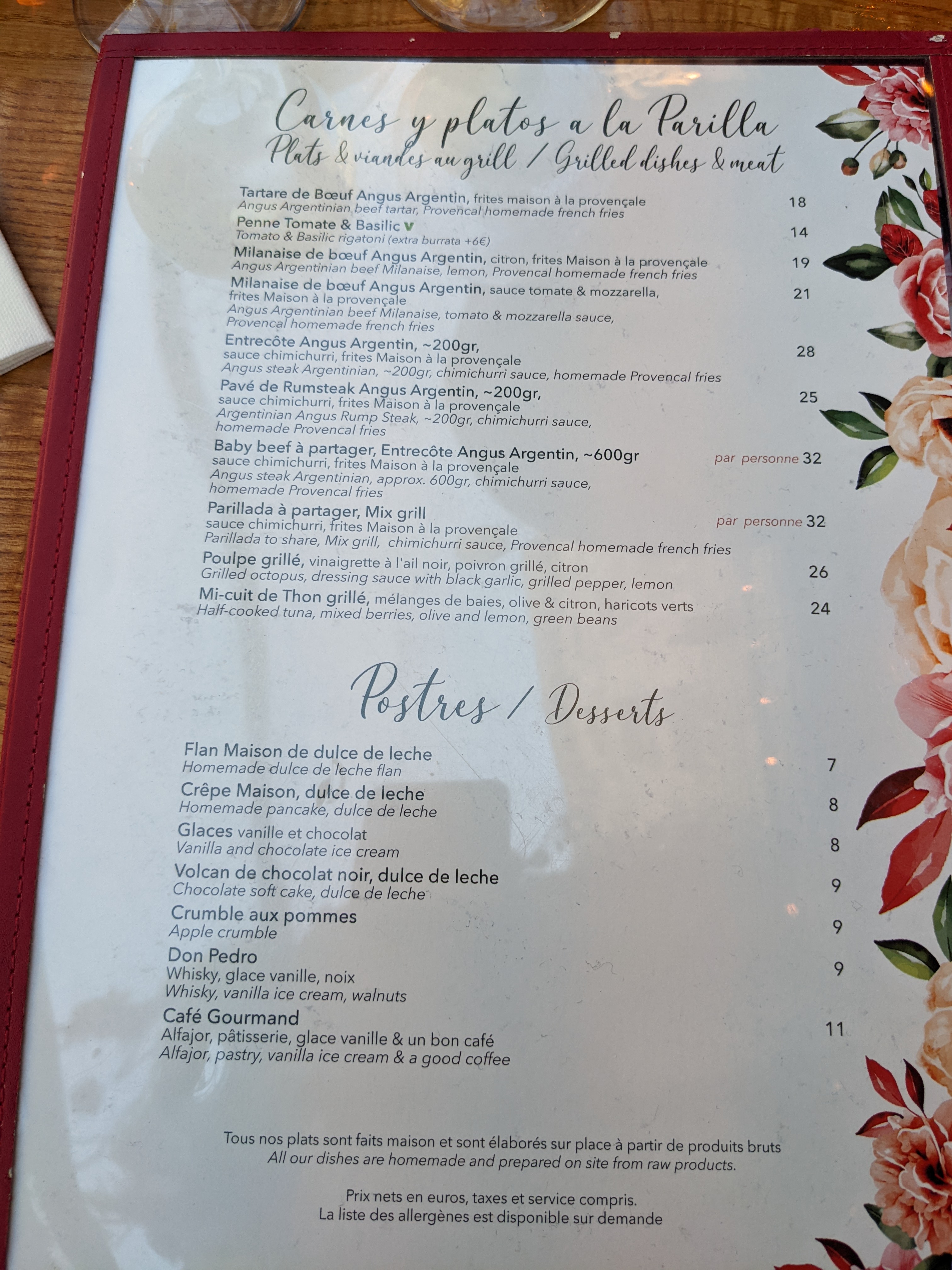 Une Saint-Valentin gâchée Avec mon copain nous voulions manger pour la Saint Valentin dans un resto argentin... Nous avons trouvé celui-ci sur internet, les avis positifs (?) et la carte nous ont convaincue, on a alors reservé une table. Alors qu'au téléphone on nous confirme bien qu'il n'y a pas de problème pour commander à la carte plutôt que de prendre le menu Saint-Valentin proposé, une fois arrivés la-bas, on nous l'impose! On a alors fini par payer 139€ car évidemment le menu obligatoire était à 70€ par personne. De plus, le service était extrêmement lent (on avait même pas de couverts pendant un bon moment) alors on décide de ne plus attendre pour les desserts et juste payer et partir au plus vite. Une fois à la caisse, on prévient qu'on a pas pris de dessert, la seule option proposée est de les prendre à emporter, ce qu'on accepte. On repart avec une facture de 139€, deux petites boules de glaces et un flan qui faisait peur à regarder (c'était les seuls options dessert dans le fameux menu). A fuir!